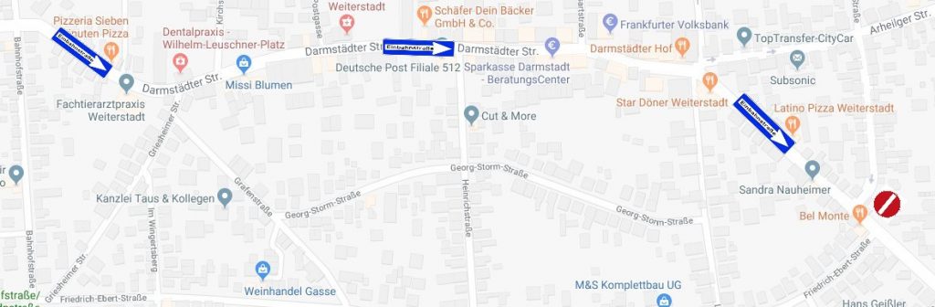 - Die Darmstädter Straße beginnend von der Kreuzung Bahnhofstraße bis zur Friedrich-Ebert-Straße als Einbahnstraße in Fahrtrichtung Friedrich-Ebert-Straße erschließen.